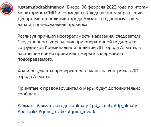 Случаем занялась полиция, о чем сообщил заместитель начальника Департамента полиции Алматы по следственной работе Рустам Абдрахманов.