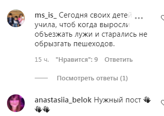 "Пешеходы, пожалуйста, отойдите от обочины! Или когда стоите на перекрёстке — отойдите подальше. Водители, притормаживайте перед лужей! Ещё раз подчеркну, пешеходы уйдите от тротуаров, которые вдоль дороги! Неудобно ехать 10 километров всю дорогу, чтобы вас не обрызгать. Но и водители… тоже давайте иметь совесть и притормаживать перед лужами! Желаю всем хорошего дня и вернуться домой сухими", — говорится в посте.
