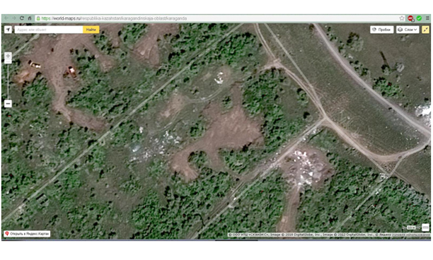Хищение почвы на северо-западе Караганды имело такие большие масштабы, что попало даже на снимки Google.map. На фото из космоса у темной кучи почвы (слева вверху) виден карьерный самосвал, а рядом погрузчик уничтожает деревья.
