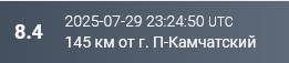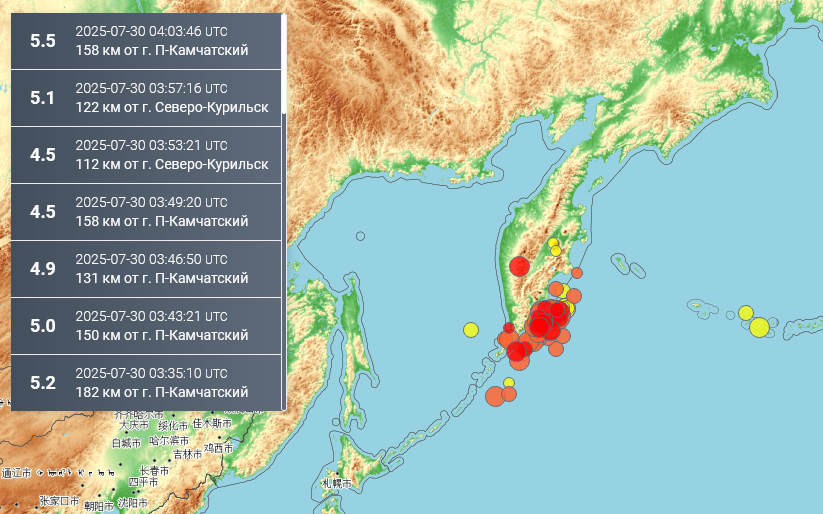 Согласно информации Камчатского филиал ФГБУН Федерального исследовательского центра «Единая геофизическая служба РАН» магнитуда самого сильного толчка составила 8,4 балла.