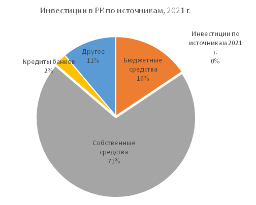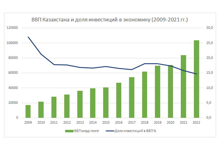Начиная с нулевых годов инвестиции в основной капитал в экономике Казахстана постоянно снижаются. Если в 2009 году доля инвестиций составляла 27 % от ВВП, то в 2021 году она упала до 14,7 %.
