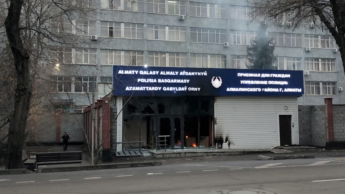 У оставшегося целым многоэтажного здания Алмалинского районного управления полиции никого не было. Лишь на верхнем этаже горел свет. Зато сожжены и разграблены оба КПП и ворота между ними. Отовсюду пробивались языки пламени и дым. Ни полицейских, ни пожарных здесь не было. Рядом с жилым домом стояла сгоревшая гражданская лековушка.