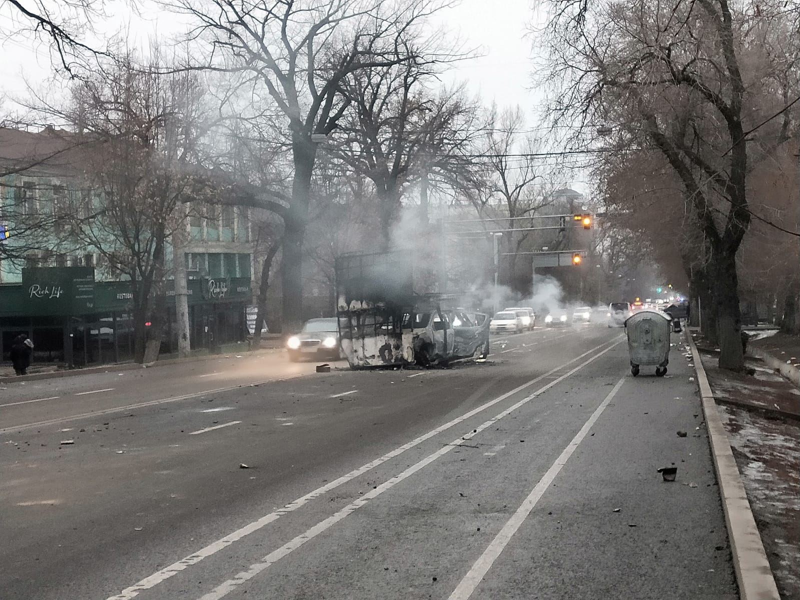 Но самое впечатляющее зрелище ожидало на пересечении Толе би и Байтурсынова. Там догорали два грузовика, для перевозки военных и еще один полицейский авто-таран для разгона демонстрантов. Прохожие с ужасом и недоумением смотрели на все это и снимали на фото и видео. В глазах у людей читался немой вопрос: «Неужели такое возможно в наше время и в центре мирного Алматы?