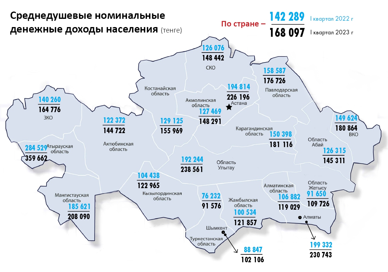 Это среднедушевые номинальные денежные доходы населения в тенге за 1 квартал 2023 года. Даже по официальным данным видно, как сильно разнятся доходы у казахстанцев в разных регионах страны. Если убрать ресурсные регионы, где средние доходы достигаются за счет высоких зарплат начальства, то бросается в глаза относительно высокий уровень жизни в Астане и Алматы. 226-230 тысяч тенге – это в полтора-два раза больше, чем во всей остальной стране. Откуда будут люди уезжать, и куда они будут стремиться?