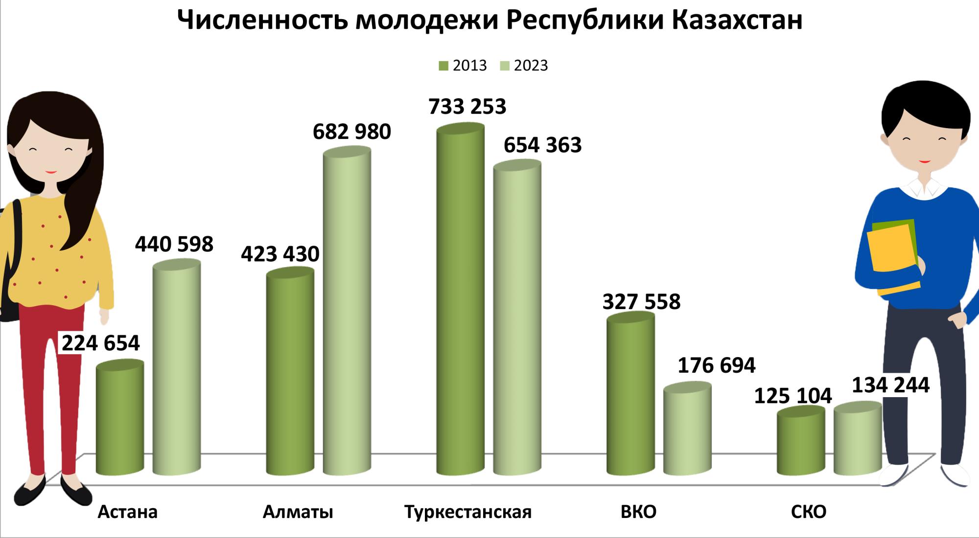Вот статистика роста городов и изменения доли молодежи в их населении. В 2013 году в Алматы проживало 423 тысячи молодых человек. через 10 лет их стало уже 683 тысячи.