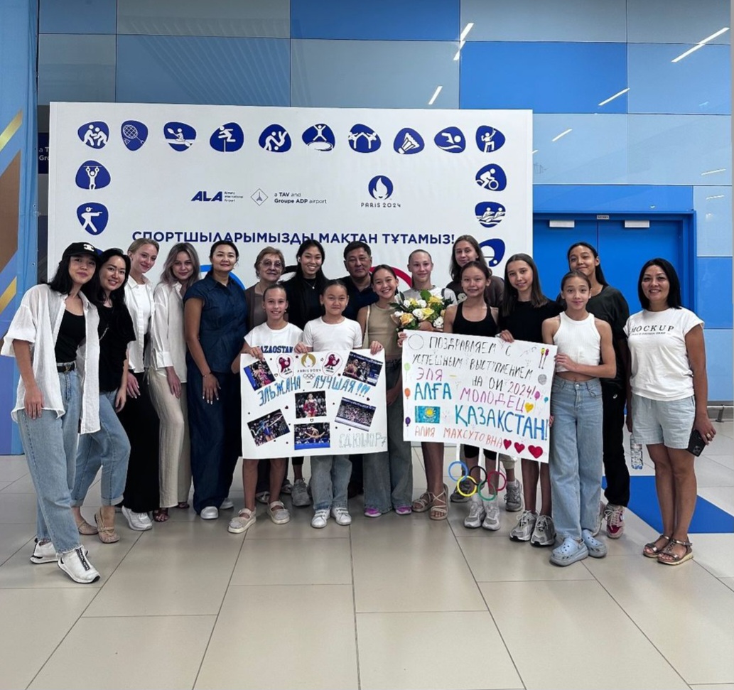 Главного тренера сборной РК по художественной гимнастике Алию Юсупову и спортсменку Эльжану Таниеву встретили в аэропорту занимающиеся этим видом спорта. Они подготовили специальные плакаты, посвященные Эльжане, не обошлось и без общей фотосессии.