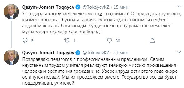 — Поздравляю педагогов с профессиональным праздником! Своим неустанным трудом учителя реализуют великую миссию просвещения человека и воспитания гражданина. Уверен, трудности этого года скоро останутся позади. Мы их преодолеем вместе. Государство всегда будет поддерживать учителей, — написал Глава государства на своей странице в Twitter.