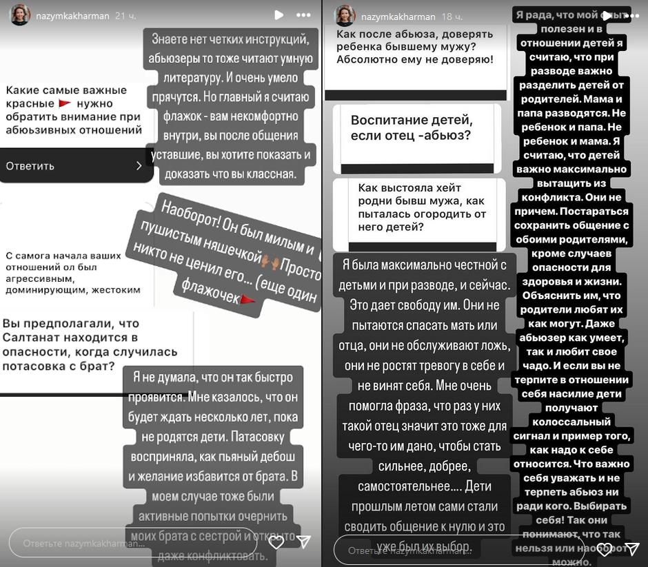 "Я была максимально честной с детьми и при разводе, и сейчас. Это дате свободу им. Они не пытаются спасать мать или отца, они не обслуживают ложь, они не растят тревогу в себе и не винят себя. Мне очень помогла фраза, что раз у них такой отец, значит это тоже для чего-то им дано, чтобы стать сильнее, добрее, самостоятельнее… Дети прошлым летом сами стали сводить общение к нулю, и это уже был их выбор", — пояснила Назым.