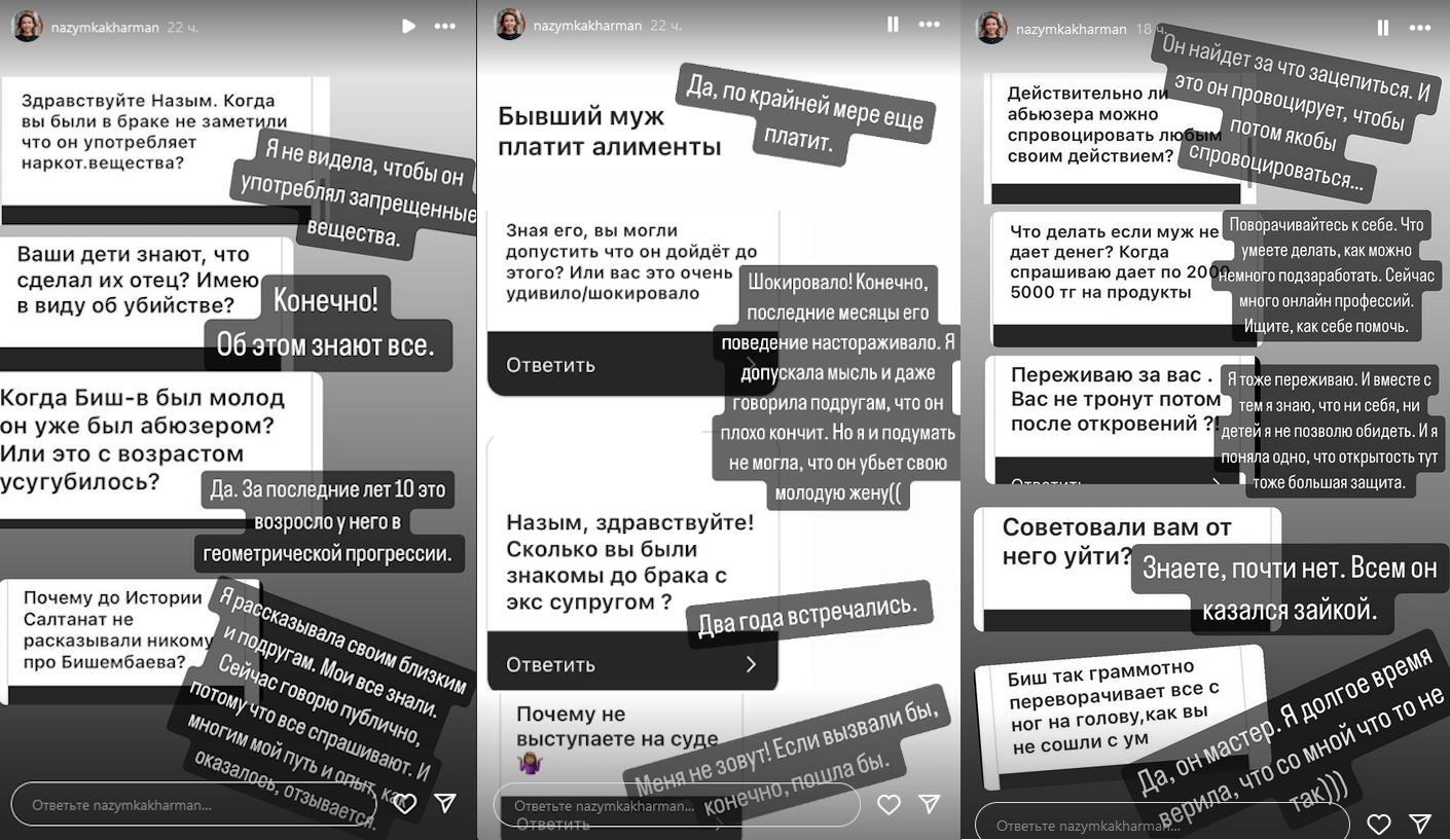 "Наоборот! Он был милым и пушистым няшечкой, просто никто не ценил его", — ответила Назым на вопрос о том, демонстрировал ли Бишимбаев агрессию и жестокость в их отношениях с самого начала.