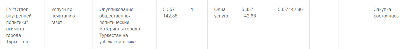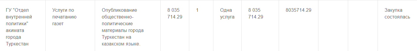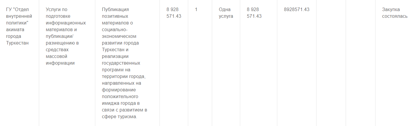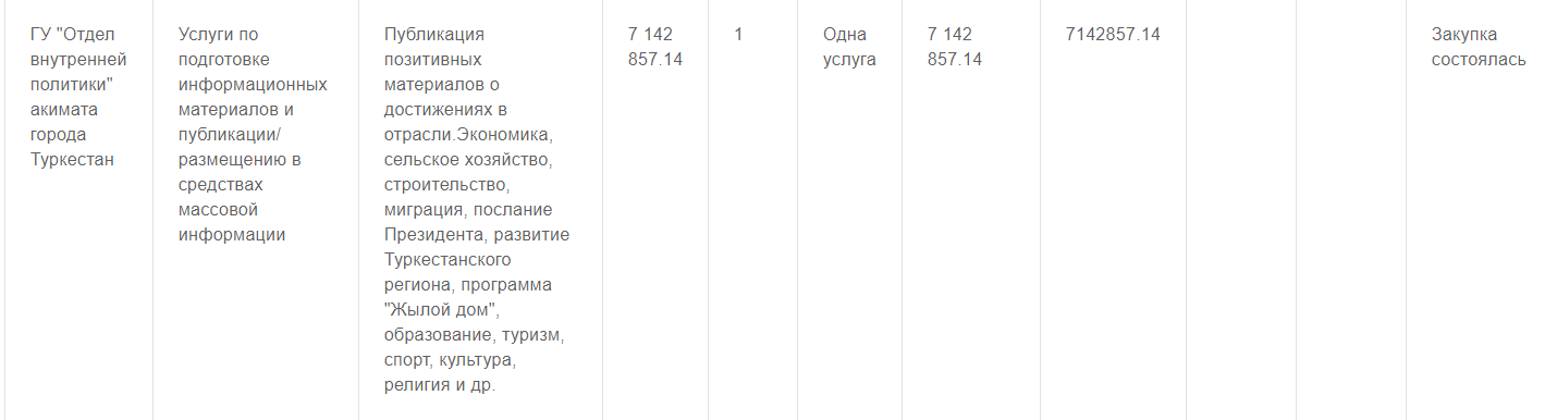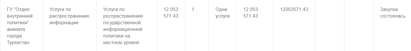 Например, в марте текущего года ГУ "Отдел внутренней политики" акимата города Туркестана опубликовал тендер по приобретению услуг по распространению государственной информационной политики на местном уровне за 12 053 571 тенге.