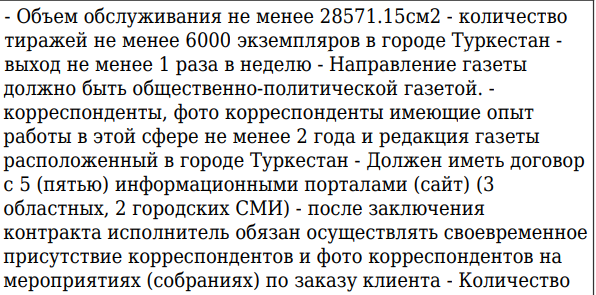 Техспецификация у двух тендеров — одинаковая, разница только в цене. И там и там речь идет о выпуске общественно-политической газеты, освещающей ключевые события политики Туркестана, естественно, с согласованием с заказчиком, тиражом не менее 6 тысяч экземпляров. Выход газеты — не менее одного раза в неделю.
