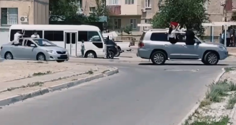 Сегодня, 1 июня, в Актау выпускной кортеж грубо нарушил правила дорожного движения. Парни и девушки ехали, высунувшись из машин через окна, и машут выпускными лентами.
