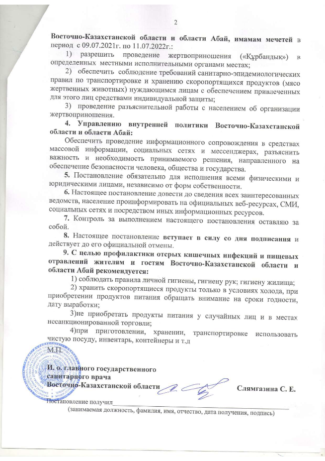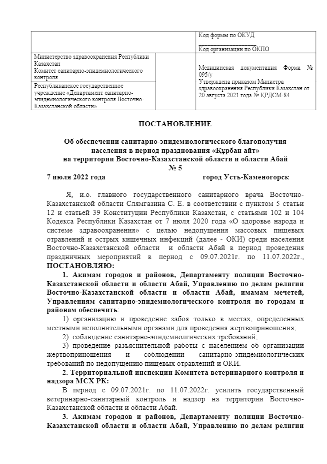 На территории Восточно-Казахстанской области и области Абай вышло постановление №5 от 7 июля 2022 года об обеспечении санитарно-эпидемиологического благополучия населения в период празднования Құрбан айт.