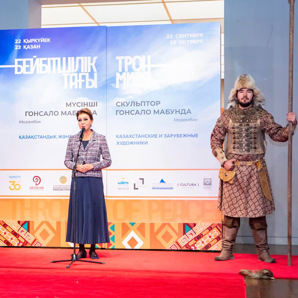 — Я рада приветствовать вас на выставке, идею которой подсказали «Трон» и «Маска» Гонсало Мабунды. Художник-пацифист Гонсало Мабунда пережил в своем родном Мозамбике все ужасы многолетней войны. И когда наконец наступил долгожданный мир, а оружие подлежало уничтожению, художник решил увековечить память о страшных десятилетиях через уникальные арт-объекты из гильз, снарядов и автоматов. Сегодня в мире снова много точек, где вспыхивают боевые действия. Инициируя выставку, я хотела через язык искусства призвать людей к согласию, напомнить о том, что в войне есть только проигравшие, она приносит страдания всем сторонам конфликта, — отметила Дарига Назарбаева.