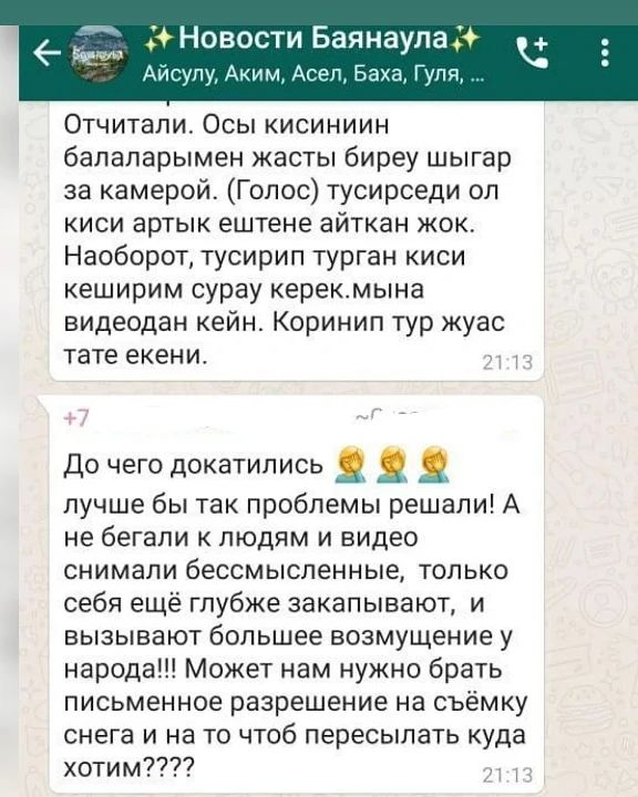Далее показаны скриншоты из чата под названием "Новости Баянаула". Человек, подписанный, как "Аким", отправил видео извинений, после чего на него обрушился поток возмущения.