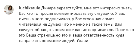 Однако, несмотря на отдельные коментарии в поддержку этой позиции, большинство резко осудило Динару за ее мнение, некоторые прямо написали, что больше не уважают ее и отписываются от страницы. Сейчас у Динары Сатжан 1,6 млн. подписчиков в Instagram.