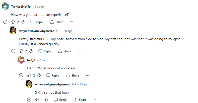 "Получила сильный стресс. Мой отель качало из стороны в сторону, моей первой мыслью было, что он сейчас обрушится. К счастью, землетрясение закончилось быстро. Я была на шестом этаже, не очень высоко", — ответила она.