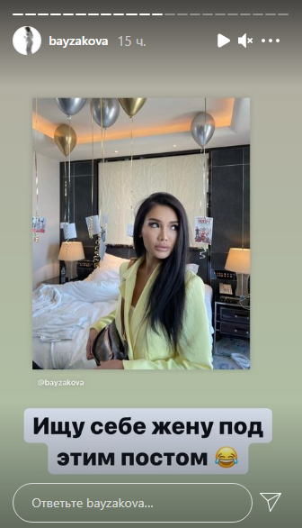 Байзакова в сториз заявила, что сожалеет, что природа сделала её не мужчиной, а потом объявила о поиске жены: