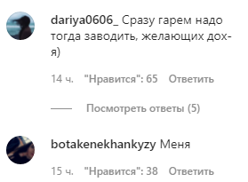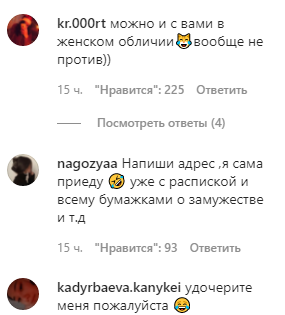 В посте Айжан пишет: "Девочки, а прикиньте, если бы я была мужиком. Женщин не обижаю, путешествовать вас с собой беру, все что надо есть, в салоны будете ходить по бартеру, машину подарю, свободные отношения, и плюс рожать вам не придётся у нас есть Аланчик. Да и плюс чай мне наливать не надо и кушать готовить, просто будете красивыми рядом и помнить какое пиво я люблю, и всегда держать его прохладным для меня. Ну ка поднимите ручки, кого в жены взять?"