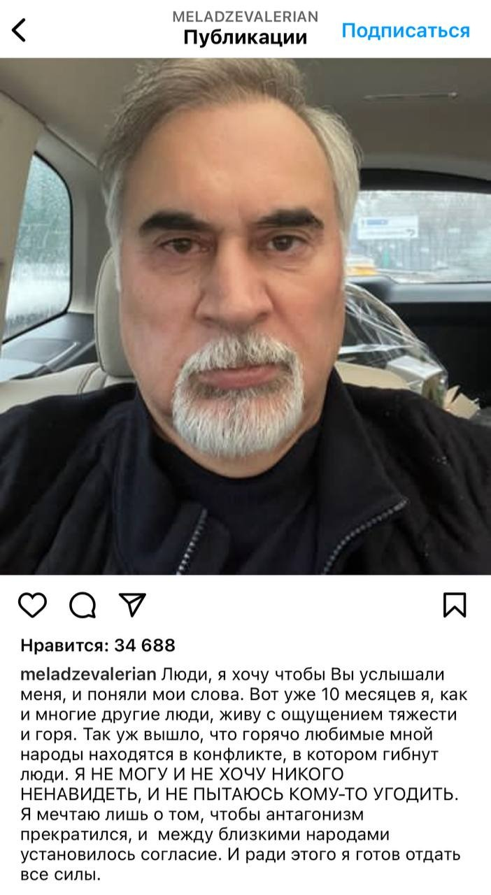 "Люди, я хочу, чтобы вы услышали меня и поняли мои слова. Вот уже 10 месяцев я, как и многие другие люди, живу с ощущением тяжести и горя. Так уж вышло, что горячо любимые мной народы находятся в конфликте, в котором гибнут люди. Я не могу и не хочу никого ненавидеть и не пытаюсь кому-то угодить. Я мечтаю лишь о том, чтобы антагонизм прекратился, и между близкими народами установилось согласие. И ради этого я готов отдать все силы", — написал Меладзе в посте.