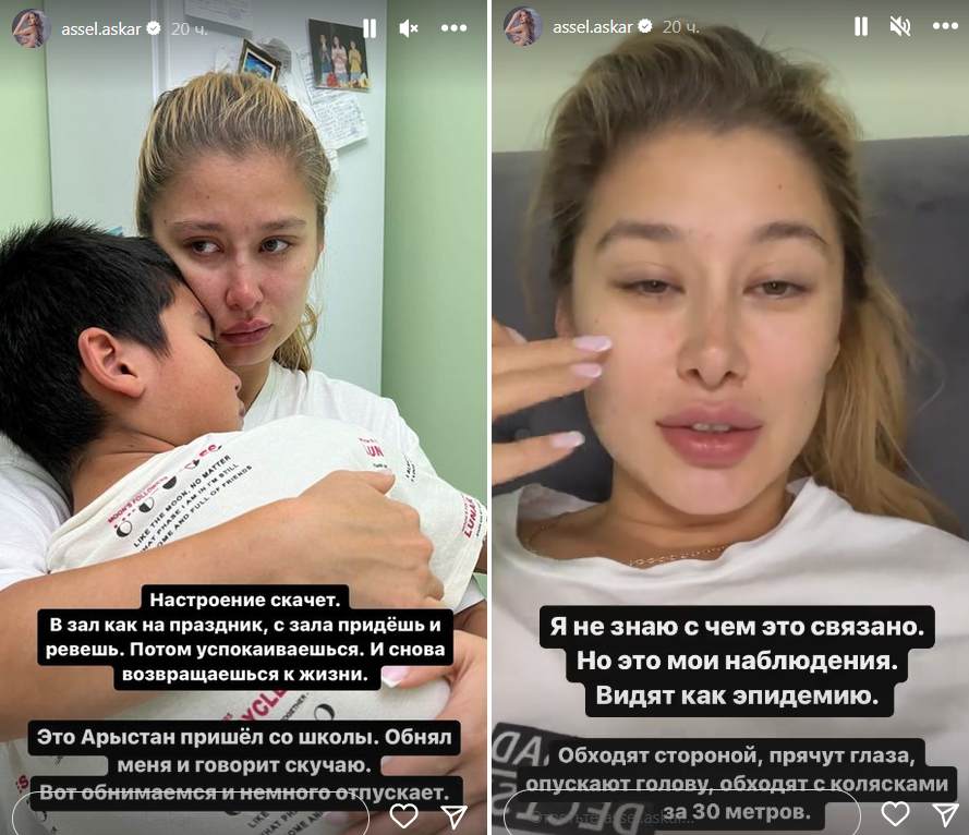 Также она проводит время со старшим сыном. Кроме того, Асель отдельно обратилась к людям, которые сталкиваются с ней в последнее время в общественных местах. По ее словам, многие из них, увидев ее, отводят взгляд или отворачиваются, отходят подальше с колясками, отводят от нее своих детей, словно боятся, что она может каким-либо образом навредить.
