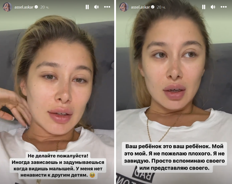 Она также отметила, что спокойно, без отрицательных эмоций смотрит сториз других блогеров, дети которых родились в этом году. В заключение Асель попросила не жалеть ее и спокойно продолжать общаться с ней, как и раньше, в том числе говорить о детях, о том, что им подарили, куда сводили и т.д.