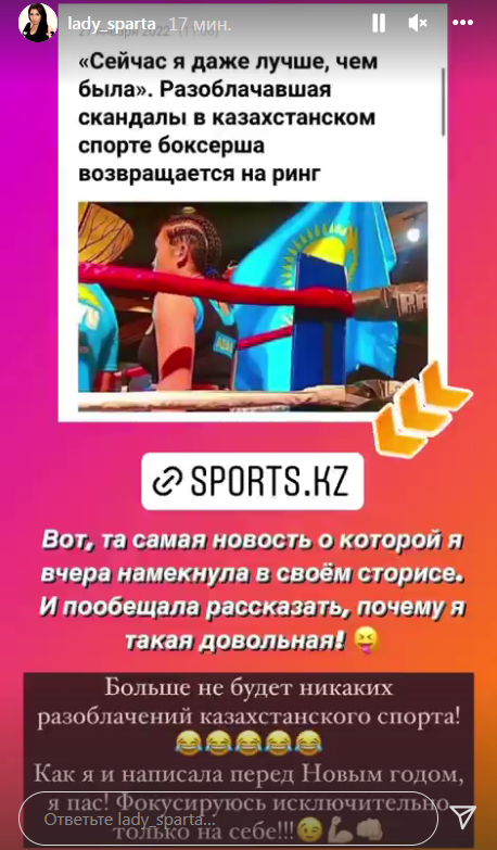 "Кто станет моей оппоненткой пока еще не знаю. В принципе, для меня и не важно. Я все время тренируюсь, даже в праздничные дни. Безумно, даже можно сказать — до фанатизма, люблю бокс. И готова показать зрелищный бой. Я очень голодна до новых побед — и знаю, что не утратила свой огонь в глазах", — заявила она.