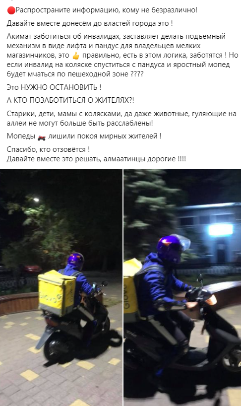 "Что же это происходит, друзья!? К кому обращаться? Сколько человек нужно собрать, чтобы написать петицию и чтобы это дошло до властей города? Эти товарищи, на мопедах, крайне нагло, быстро двигаются по пешеходным зонам. Там, где жители гуляют с детьми, там, где старики медленно гуляют с тросточками. Там, где инвалиды беззащитно едут на коляске. Нагло, дерзко, преследуя одну цель — как можно больше сделать заказов, они мчатся по пешеходным зонам. При этом используют мобильное устройство, развлекая себя. Одно неверное движение может дорого обойтись. Он уедет, и след простыл, никто не сможет распознать владельца этого мопеда. Давайте вместе найдём «противоядие» против этого беспредела! Мало того, их средства передвижения не снабжены номерами, и я глубоко сомневаюсь, что у водителей данного транспорта есть права. Старики, дети, мамы с колясками, да даже животные, гуляющие на аллее, не могут больше быть расслаблены. Мопеды лишили покоя мирных жителей", — написала в городском паблике алматинка Инна Мясникова.