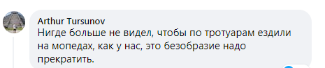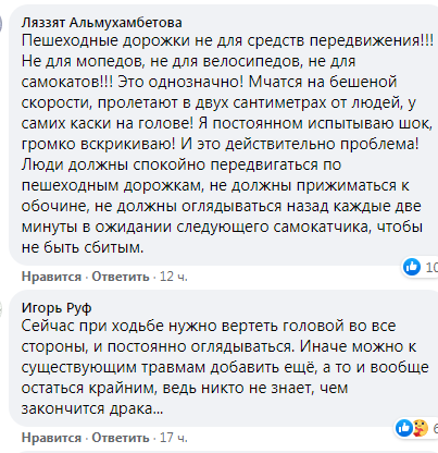 "Пешеходные дорожки не для средств передвижения! Не для мопедов, не для велосипедов, не для самокатов. Мчатся на бешеной скорости, пролетают в двух сантиметрах от людей, у самих каски на голове! Я постоянно испытываю шок, громко вскрикиваю! И это действительно проблема. Люди должны спокойно передвигаться по пешеходным дорожкам, не должны прижиматься к обочине, не должны оглядываться назад каждые две минуты в ожидании следующего самокатчика, чтобы не быть сбитым", "Сейчас при ходьбе нужно вертеть головой во все стороны и постоянно оглядываться. Иначе можно к существующим травмам добавить ещё, а то и вообще остаться крайним, ведь никто не знает, чем закончится драка", "Нигде больше не видел, чтобы по тротуарам ездили на мопедах, как у нас, это безобразие надо прекратить", — пишут алматинцы в комментариях к посту.