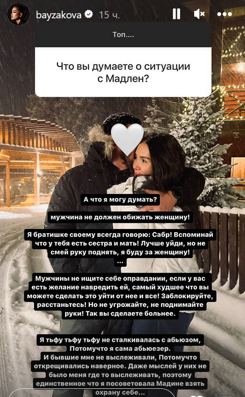 Я не сталкивалась с абьюзом. Потому что я сама абьюзер. И бывшие меня не выслеживали. Потому что открещивались, наверное. Даже мыслей у них не было меня где-то выслеживать, поэтому единственное, что я посоветовала Мадине, — взять охрану себе ", — поделилась Айжан.