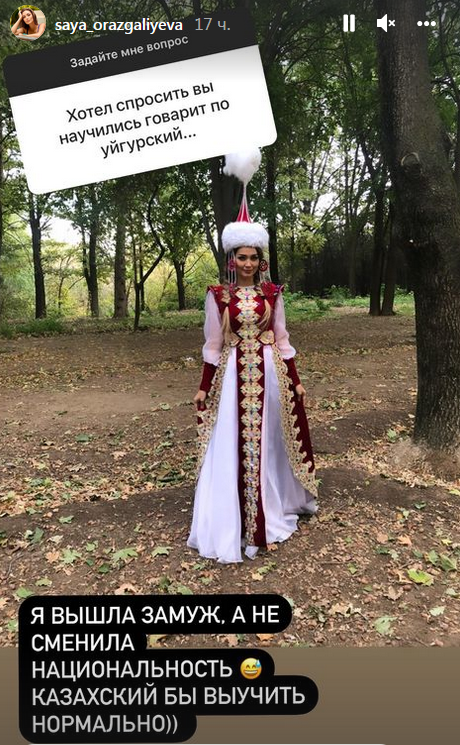 Один из подписчиков спросил артистку, научилась ли она говорить по-уйгурски. В ответ Сая Оразгалиева написала, что вышла замуж, а не сменила национальность, и сначала предпочла бы нормально выучить казахский язык.