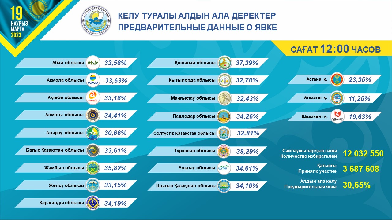 Согласно данным, представленным областными, городов республиканского значения, столицы комиссиями по состоянию на 12:10 бюллетени получили 30,65 % от общего количества граждан, включённых в списки, передаёт медиа-портал Caravan.kz.