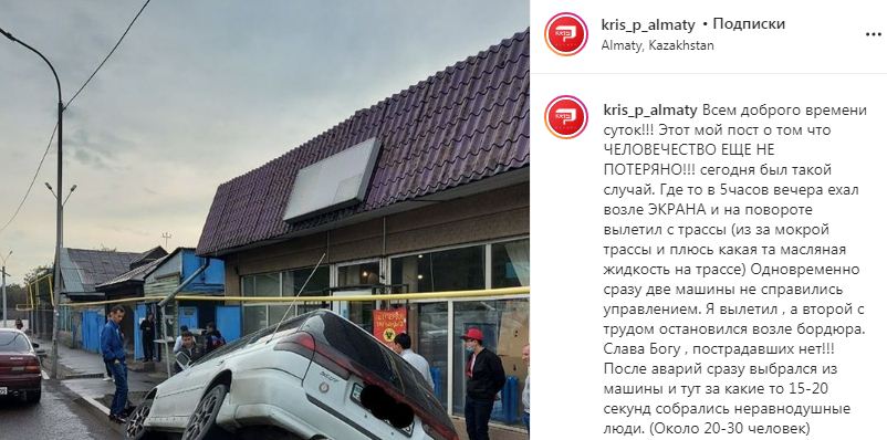 «Это мой пост о том, что человечество еще не потеряно. На повороте вылетел с трассы (из-за мокрой трассы и плюс какая-то масляная жидкость на трассе). Одновременно сразу две машины не справились управлением. Я вылетел, а второй с трудом остановился возле бордюра. Слава Богу, пострадавших нет! После аварии сразу выбрался из машины, и тут за какие-то 15-20 секунд собрались неравнодушные люди — около 20-30 человек», — поделился алматинец.