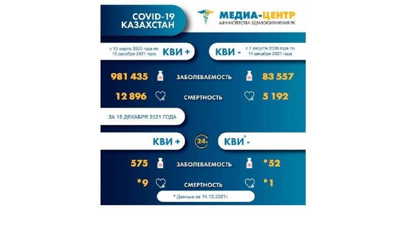 Рост заболеваемости коронавирусной инфекции зафиксировали в Казахстане. Согласно данным МВК по нераспространению COVID-19, на 15 декабря в стране выявили 575 новых случаев заболевания, что на 87 больше, чем днем ранее, сообщает медиа-портал Caravan.kz.