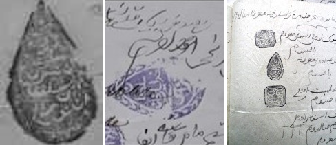 Слева направо: печать султана Тезека Торе на документе 1860 года; печать Кудиярхана, сына Тезека Торе в избирательном списке 1913 года; печать султана-бия Тажи Канкожаулы и его биев.