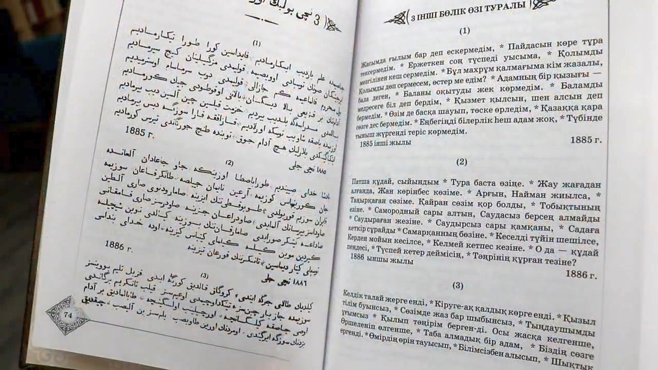 – Эта книга занимает особое место в серии “Абай әлемі”. Первый сборник произведений великого казахского поэта опубликован в Санкт-Петербурге в 1909 году в типографии Ильяса Бораганского. Текст напечатан арабской графикой и кириллицей в одном издании, что воспроизведено в нашем репринтном издании, – пояснила специалист библиотеки им. Абая Лаура БУРКУТОВА.