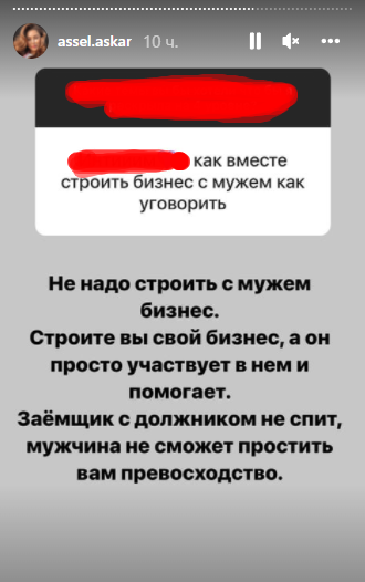 Асель Аскар в сториз в Instagram объяснила, почему не стоит вести с мужем общий бизнес, передаёт медиа-портал Сaravan.kz.