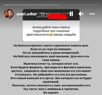 Кроме того, Асель Аскар рассказала, как женщине следует относиться к мужским гениталиям: