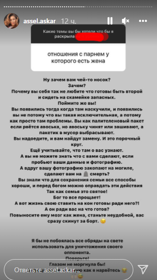 Ещё Асель Аскар рассказала, как бы она расправлялась с соперницей в любви, и призналась, что не побоялась бы совершать любые обряды. Кроме того, она считает, что "бог простит", если закопать фотографию другого человека на могиле: