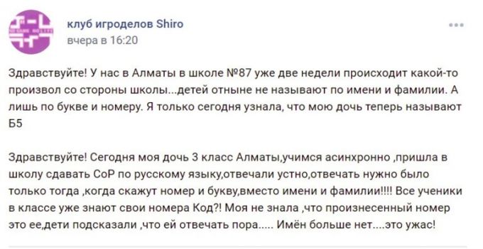 — В ходе проверки указанных фактов обращения к учащимся КГУ ОШ №87 по букве и номеру информация не подтвердилась, — сообщил главный специалист управления образования Алматы Куандык Ешимет.