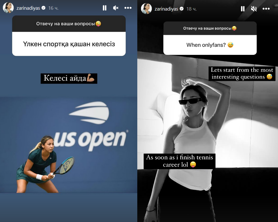 "Начнем с самых интересных вопросов. Когда завершу теннисную карьеру", — ответила со смеющимся смайлом Зарина.