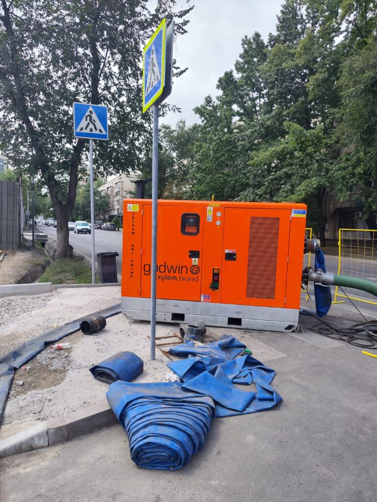 Кроме того, прямо у пешеходного перехода на Муканова и Кабанбай батыра стоит насосный агрегат с разложенными шлангами. Он тоже занимает тротуар, мешает пешеходам и водителям.