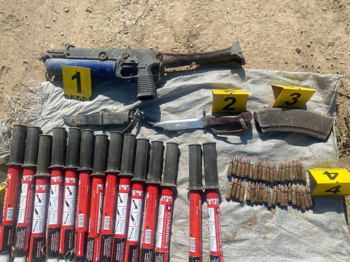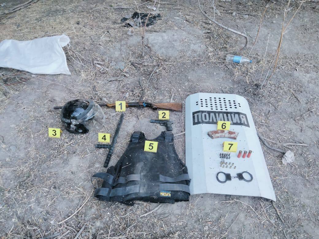 Также сотрудниками полиции ОП-2 УП города Тараз при проведении оперативно-розыскных мероприятий на одной из улиц областного центра среди мусора было найдено спрятанное ружье ИЖ-ЗК 16-го калибра, травматический пистолет ТТ-Лидер, 23 боеприпаса различного калибра, магазин от автомата АКСУ, полицейская каска, бронежилет, палка резиновая и полицейский щит.