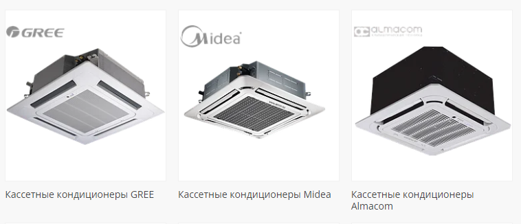 Кассетные кондиционеры подходят для просторных помещений примерно до 50 квадратных метров. Обычно их размещают в коттеджах, больших гостиных и т.п. Они крепятся к потолку и распределяют воздушные потоки, поэтому охлаждение или нагревание воздуха происходит довольно быстро. Правда, их редко можно увидеть в магазинах бытовой техники: чаще всего этим занимаются специализированные компании, они же и устанавливают. Монтаж довольно сложный и дорогой, к тому же для него требуется подвесной потолок.