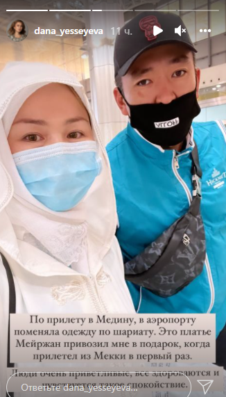 Дана выложила фотографию, где она рядом с Мейржаном в белом платке и закрытом платье. Она подписала сториз: "По прилёте в Медину в аэропорту поменяла одежду по шариату. Это платье Мейржан привозил мне в подарок, когда прилетел из Мекки в первый раз. Люди очень приветливые, все здороваются, и чувствуется такое спокойствие".