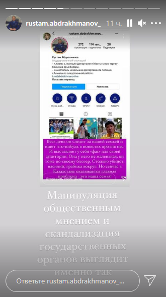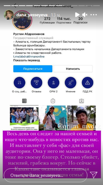После того как заместитель начальника департамента полиции Алматы Рустам Абдрахманов публично осудил блогера Мейржана Туребаева, его жена пожаловалась, что люди начали её травить: "Весь день он следит за нашей семьёй и ищет что-нибудь в новостях против нас. И выставляет у себя "фас" для своей аудитории. Она у него немаленькая, он тоже по-своему блогер. Столько убийств, насилия, грабежа вокруг. Но сейчас в Казахстане, оказывается, главная проблема — наша семья!"