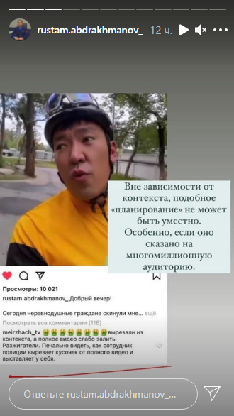 Ранее Рустам Абдрахманов отреагировал на видео, на котором вайнер Мейржан Туребаев заявил, что будет сбивать старушек, пока им не сделают велодорожку до Медеу: "На видео он заявляет, что планирует "сбивать бабушек" во время езды на велосипеде. Печально видеть, как блогер с трехмиллионной аудиторией открыто заявляет о планируемом правонарушении в отношении беззащитных против него пожилых людей". Правда, этот пост со страницы он уже удалил, однако оставил комментарий в сториз: