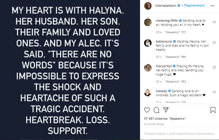 — Мое сердце с Галиной, с ее мужем, сыном, их семьей и любимыми. И с моим Алеком. Нет таких слов, которыми можно описать шок и боль в сердце от такой трагической случайности. Сердце разбито, — сообщила жена артиста, пишет Lenta.ru