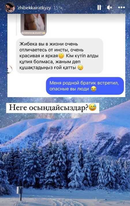 "Жибека, вы в жизни очень отличаетесь от Instagram, очень красивая и яркая. Кто вас ждал, если не секрет? Так обняли крепко, назвав "жаным", — написала девушка.