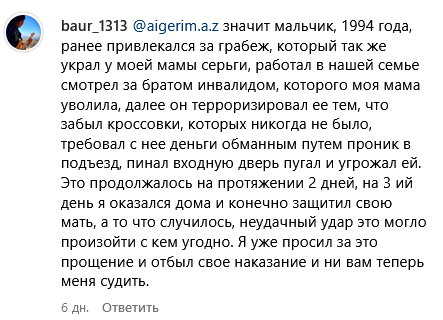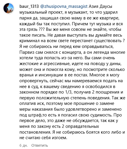 Сам музыкант считает виновным в произошедшем пострадавшего парня, обвинив его в краже, угрозах и запугивании. Об этом Ашигалиев написал в комментариях на своей странице в Instagram.